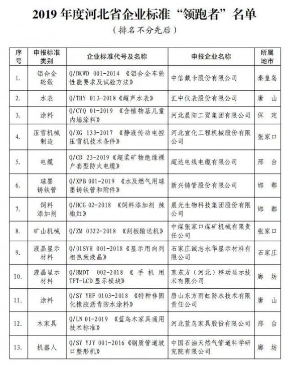 日前,河北省市場監(jiān)督管理局發(fā)布《2019年度河北省企業(yè)標(biāo)準(zhǔn)“領(lǐng)跑者”名單》,晨……