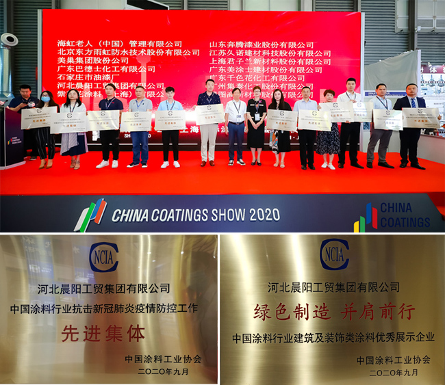 因在疫情防控期間的突出的擔當及貢獻,在2020中國國際涂料博覽會授牌儀式上,河北晨陽工貿集團榮獲“中國涂料行業抗擊新冠肺炎疫情防控工作先進集體”及“中國涂料行業建筑及裝飾類涂料優秀展示企業”兩項榮譽。
